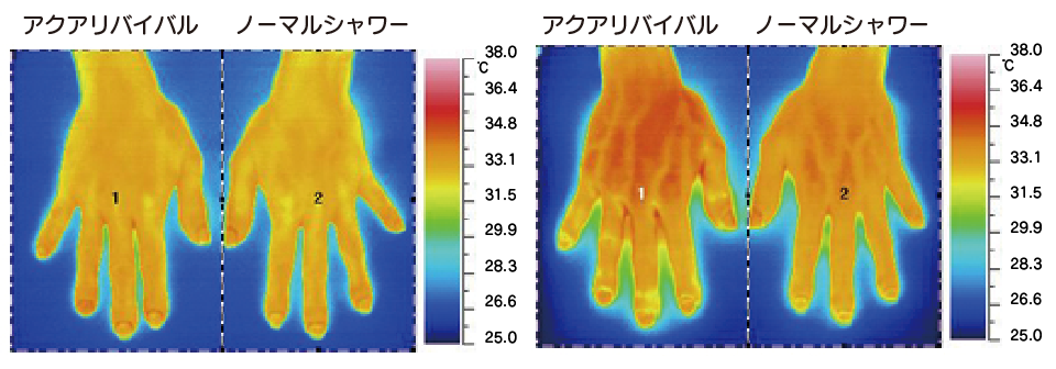 ノーマルシャワーヘッドとアクアリバイバルシャワーヘッドで、左右の手にそれぞれお湯をかけて肌温度を測定しました。 (左の画像がシャワーを当てる前の状態。右の画像がシャワーを当てた後の状態。)肌の温まり具合を見てみると、アクアリバイバルシャワーヘッドを使用した方が温まりやすいことがわかります。