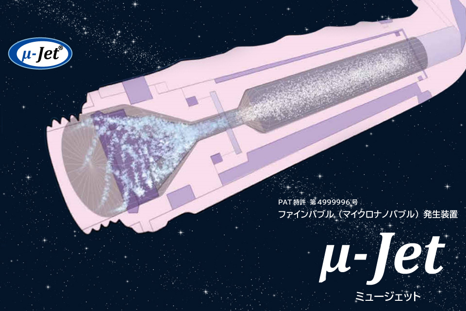 ファインバブル発生装置「μ-Jet(ミュージェット)」は、流れてきた水をμ-Jet内でクルクルと螺旋状に回転させます。(竜巻を想像してください。) 渦の中心に空気の軸ができて、それを流れている水に取り込んでいくのです。そこで生まれるファインバブルの中でも10,000分の1㎜より小さな極小の泡がウルトラファインバブルです。この特許技術を装填したアクアリバイバルTS-Ⅱは1㏄当たり約1億5,000万個のウルトラファインバブルを発生します。