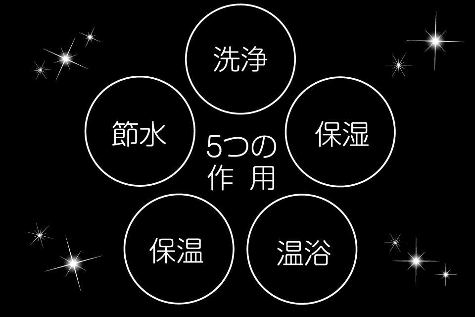 細かいところまで入り込む洗浄作用・肌水分量UPの保湿作用・肌表面温度アップの温浴作用と保温作用・50%の節水作用があります。