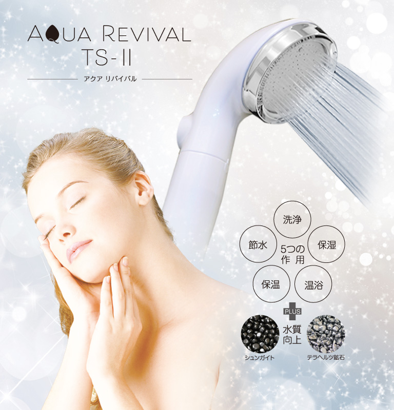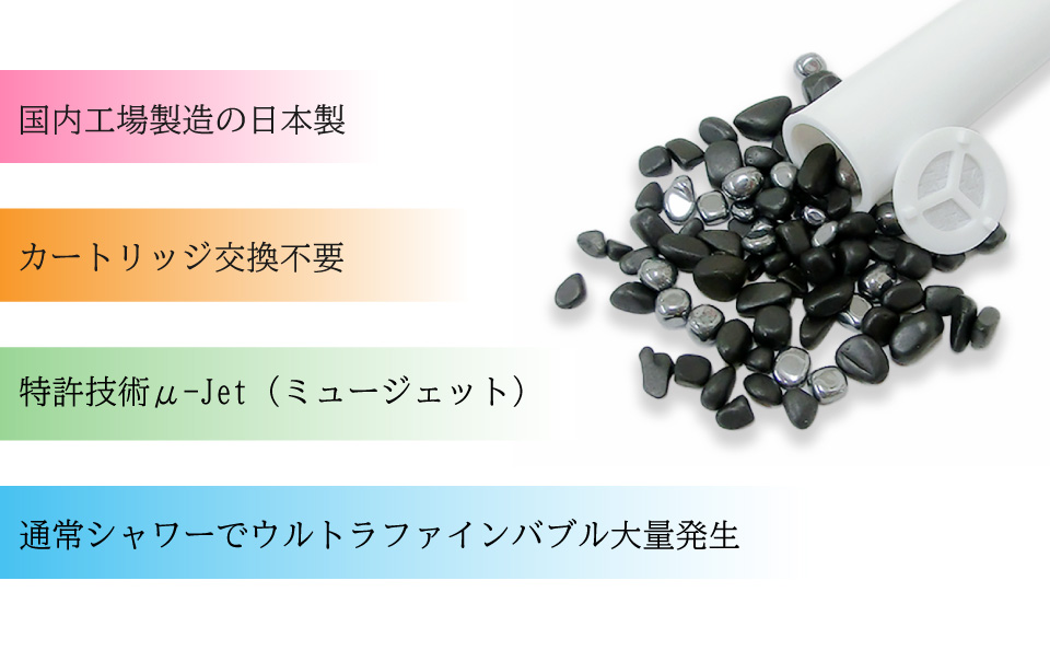 アクアリバイバルTS-Ⅱは、国内の工場で製造された日本製です。特許技術μ-Jet(ミュージェット)により、通常のシャワーでウルトラファインバブルを大量発生(1mL当たり約1.5億個以上)します。カートリッジに使用されている鉱石は劣化することもなく、半永久的に使用することが可能です。(フィルターが気になる場合は交換可能です。)